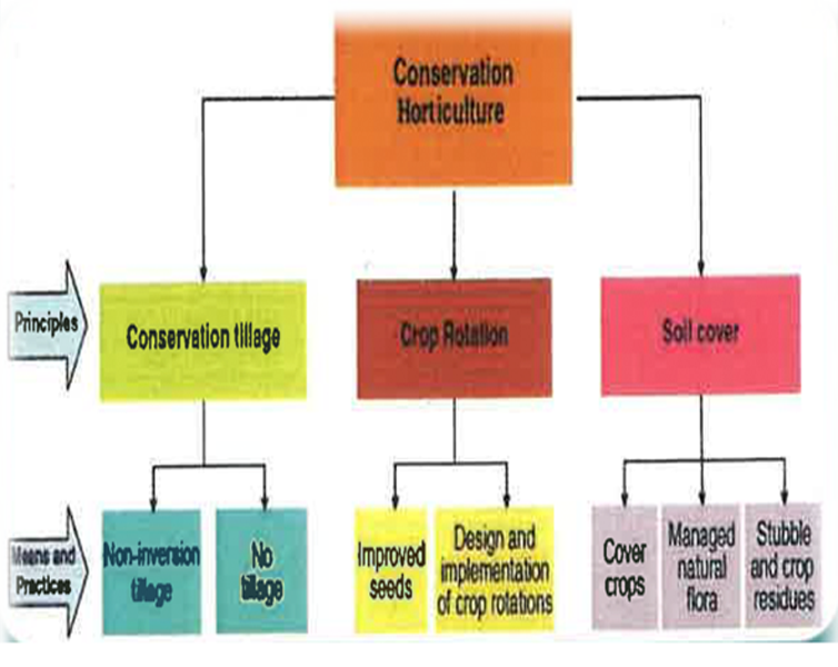 Horticulture in whatever age, whether natural, economic and social conditions, has to provide nutritional security to human beings. Conservation Agriculture has gained increasing interest worldwide over the last couple of decades. This approach to farming is very attractive for farmers: it boosts yields, saves labour and money, and helps to conserves the soil and the environment. Conservation Horticulture (CH) is a powerful mechanism to adapt to climate change by increasing resilience to drought and water-use efficiency. Climate change is believed to have a great impact on soils. Soil organic carbon gets oxidized and depleted with increasing temperatures. Runoff /wind erosion incidences may increase due to increase in extreme climatic events and are reflected in poorer soil fertility, loss of soil biota, water stress and ground water depletion. This is a system based on minimal soil disturbance (no-till, minimum tillage) and permanent soil cover (mulch, crop residue) combined with diversified rotations with legumes. The central theme of these is the maintenance of a permanent or semi-permanent soil cover – be it a live crop or dead mulch – that serves to protect the soil from sun, rain, and wind erosion and to feed soil biota.