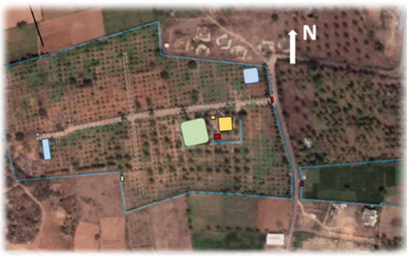 Apart from rain water harvesting/recharging in the NE corner (lowest point in elevation of the farm) through a 60’x60’x10’ pond, the farm has a 4,00,000 litre capacity water storage tank built into the ground and standing tall, at the SW corner of the land which is almost a 60’ higher elevation naturally than the NE
